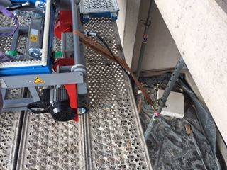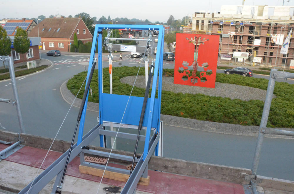 Hier wordt de bouwlift gewoon op de steiger geplaatst terwijl de achterpoten worden ingeklapt. Aan de achterkant is een riem gespannen om te voorkomen dat hij kantelt. Om de lastoverdracht zo ver mogelijk naar buiten te houden, worden er in het voorste gedeelte vierkante balken onder geplaatst.