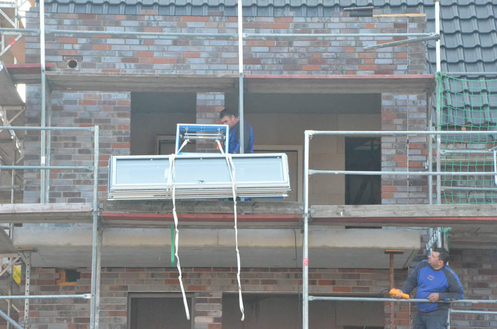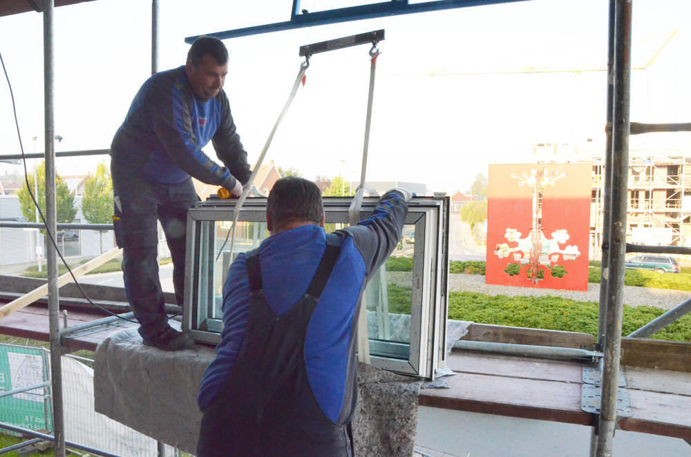 Inbouw van ramen in een bedrijfshal met kantoren. Ook al waren de ramen hier niet groot, het waren er wel veel. Toch werd ook hier een geschikte opening voor de lift gevonden. Hier werden verschillende ruiten tegelijk opgetrokken, maar deze bleven zelfs in horizontale positie beschermd, dankzij de kurk.