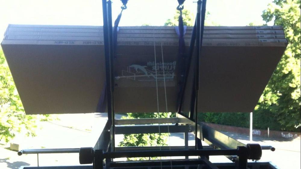 In dit geval was de loggia zo smal dat de deuren alleen aan de rand omhoog konden worden gebracht. Niettemin bespaarde het gebruik van de bouwlift alle betrokkenen een wandeling van 30 m en de trap.